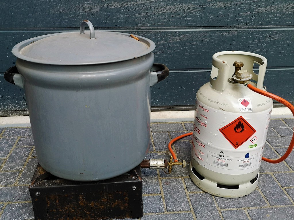 Voor het koken van grote hoeveelheden maak ik gebruik van een industrie- of wokbrander met een losse gasfles. Op marktplaats heb ik een grote kookketel op de kop kunnen tikken waardoor ik vele kilo’s in één keer kan bereiden. Bijkomend voordeel is dat je de keuken ook nog een beetje netjes houdt, dan is de vriendin ook blij ;-). Tijgernoten kook ik na het weken nog een half uur waarna ik ze wegzet in het kookvocht. Na verloop gaat dit vocht slijmen en dan zijn ze wat mij betreft op hun best! Hennep, maples en pinda’s kook ik ongeveer vijftien tot twintig minuten waarna ik ze net als tijgernoten minimaal een dagje wegzet in hun kookvocht. Goede hennep is dan te herkennen aan de witte kiemen die tevoorschijn komen.