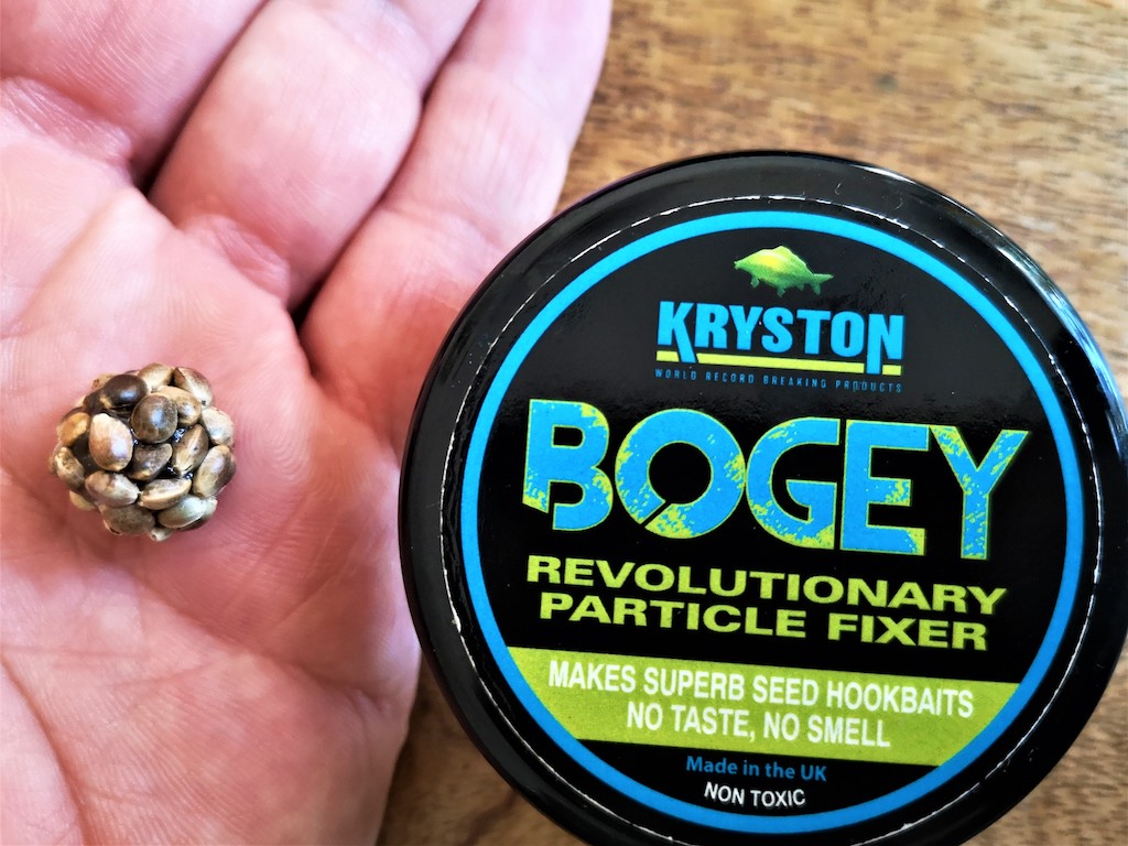 De meeste partikels zijn prima op de hair te monteren door middel van een boilienaald. Wil je echter met hennep of bijvoorbeeld tarwe vissen dan wordt het een stuk lastiger, toch is daar ook een oplossing voor! Bogey is een product van Kryston dat al heel lang op de markt is, maar de meeste mensen niet kennen. Het is een taai en plakkerig soort gel waarmee je klein aas, zoals bijvoorbeeld hennep, kan fixeren tot kleine balletjes of rond een kurkje kan plakken. Houd zo’n balletje klein om het zo dicht mogelijk te houden bij het gevoerde aas.