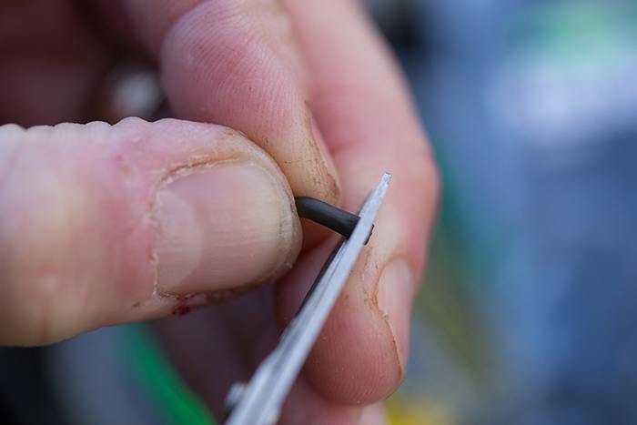 Voor wat extra gewicht schuif ik een sinker op de braid.