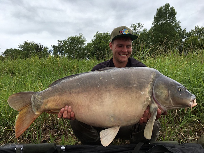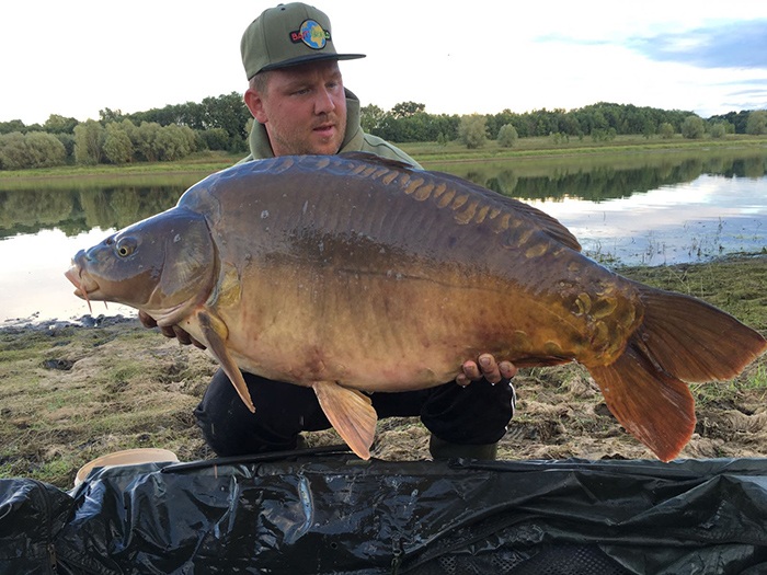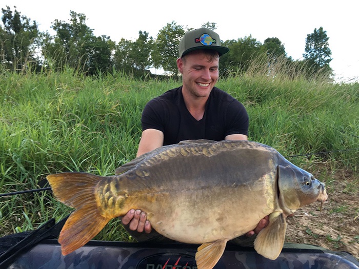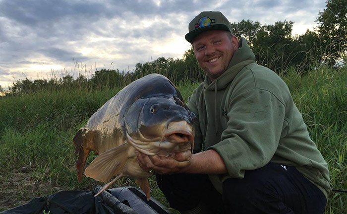 Al snel is het weer prijs met wederom een mooie spiegel van 18 kilo voor Rogier. We zijn los! Het voelt heerlijk om na een week hard werken eindelijk goed te vangen. Ik hoef dan ook niet uit te leggen dat we met volle teugen genieten! Niet veel later loopt ook mijn hengel weer af met daaraan een kleinere spiegel. Tijdens het onthaken zie ik dat deze vis gitzwarte ogen heeft. Ik had nooit eerder van een zogenaamde ‘black eye’ gehoord maar ik zag op internet dat het blijkbaar wel vaker voorkomt.