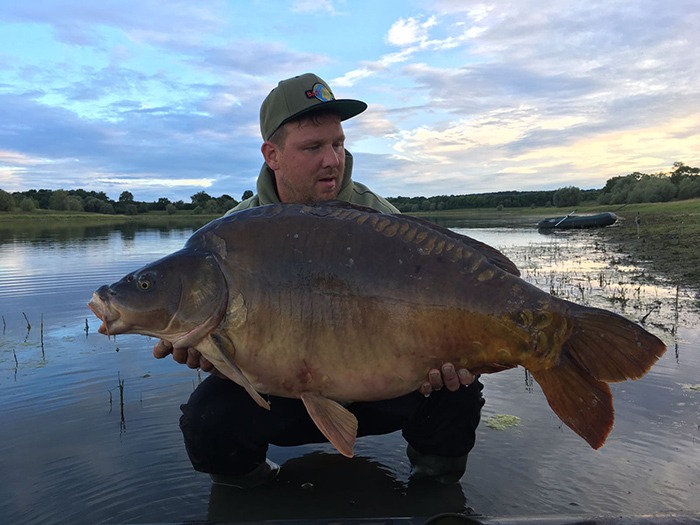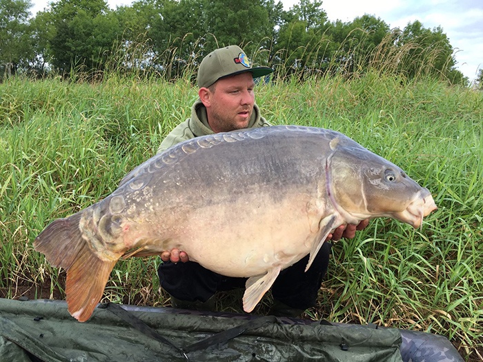 Na een dril van een kwartier kwamer een grote rug boven en al snel gleed hij mijn schepnet in. Rogier keekme aan en de blik in zijn ogen zeigenoeg. “En?” vroegik vertwijfeld. Toenik naar voren liepzag ik, tot mijn grote geluk, een brute spiegel in het landingsnet liggen. De vis bleek23,6 kilo te wegen. Yes! Dit maakte heel veel goed! Snel zetten we beide vissen op de foto en worden de lijnen opnieuw uitgevaren.