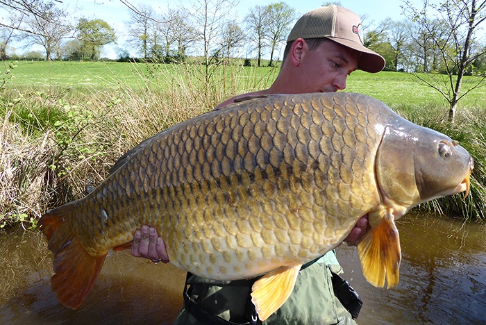 Een ronnie-rig met fluo pop en een klein handje voer moest het doen. De tactiek bleek te werken, want aan het einde van de middag kreeg ik een volle fluiter. Na een spectaculaire dril, waarbij deze mastodont meerdere keren de opkomende lelievelden in schoot, kon m?n maat het net onder de zwaarste vis van de sessie schuiven. Wat een kanon!