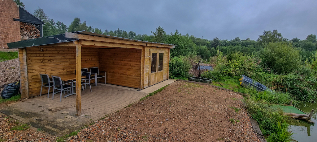 Tegen meerprijs is ook de aanwezige petroleumkachel te gebruiken. De blokhut is voorzien een eettafel inclusief vier stoelen onder het overdekte terras. Op elke stek ligt een boot welke tegen een kleine meerprijs gehuurd kan worden. Daarnaast heeft elke stek een grote onthaakmat, weegsling, tri-pod en een schepnet. Dit scheelt weer een enorme stanklucht op de terugweg in de auto 😉