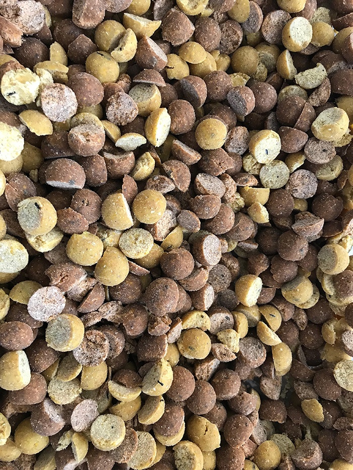 Crush met behulp van een crusher (of de blender van je vriendin?) een tiental handen boilies tot kruim. Snij daarnaast een tiental handen boilies doormidden, middels een cutter of een simpel mesje. Maak een kan aan met een mix van Krill- (20%), Liver-liquid (50%) en water (30%) en schud deze goed door elkaar tot n mengsel. Het voordeel is dat door deze verdunning, de mix goed plakkerig wordt waardoor het boiliekruim lekker blijft plakken op de grotere voerdelen!