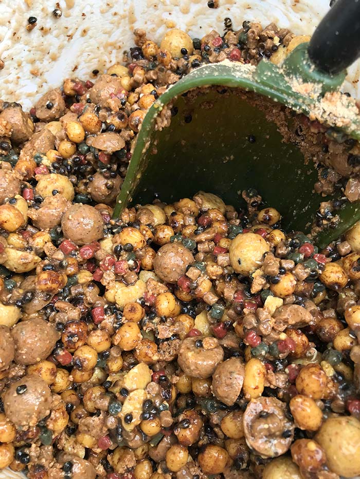 Voeg de hele en halve boilies samen in een ton en voeg hieraan een aantal scheppen pellets, tijgers, hennep en boekweit toe. Meng dit geheel goed door elkaar totdat het een geheel is/lijkt. Voeg vervolgens (een) goede scheut(en) van de liquid-samenstelling toe en meng het geheel nogmaals door elkaar. Voeg als laatste pas het boiliekruim toe, door dit op het laatste moment te doen zorg je dat je voorkomt dat al het kruim onderin op de bodem vastplakt.