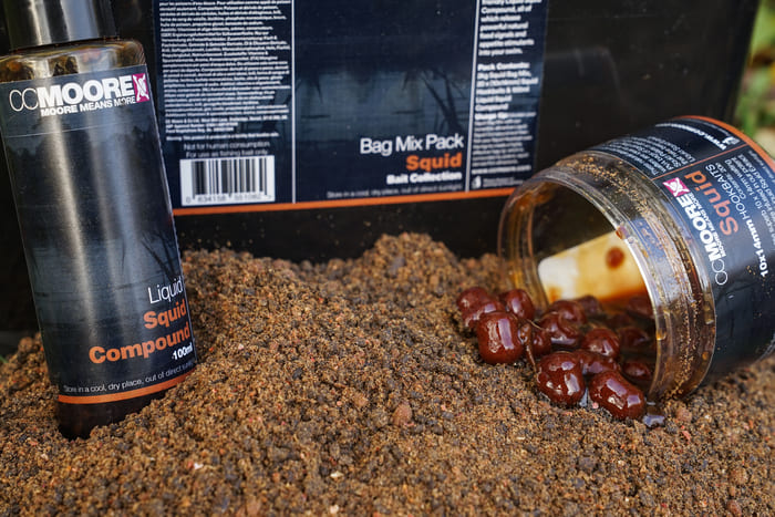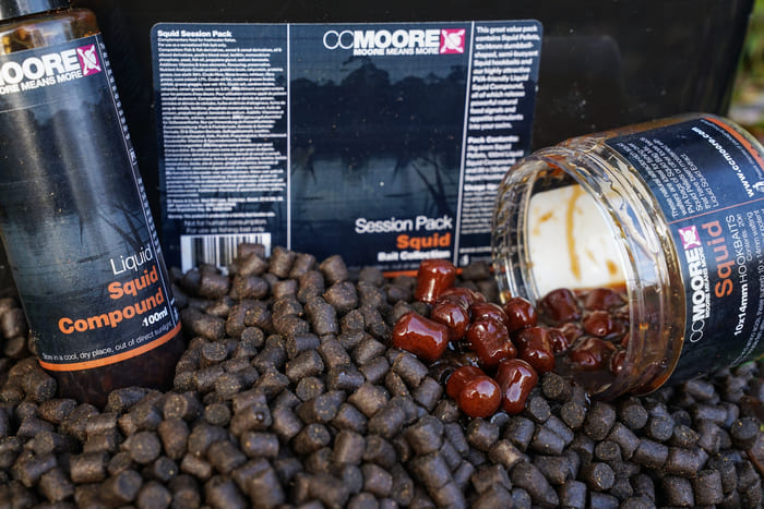 De Session Pack bevat twee kilo Squid Pellets in de zes millimeter variant, 100ml Liquid Squid Compound en twintig stuks Squid Hookbaits 10x14mm. Ook dit pakket wordt geleverd in een CC Moore Bait Bucket.