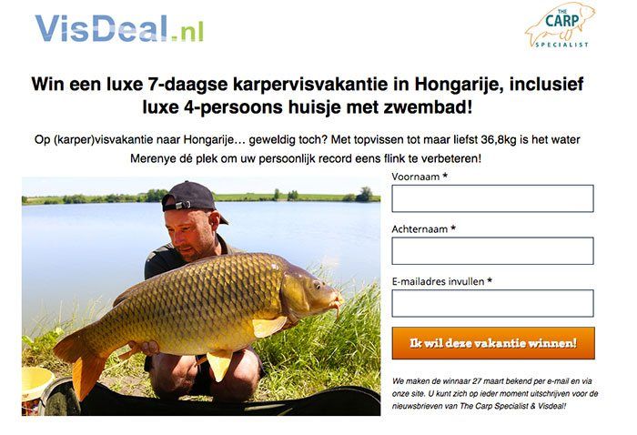 Na al deze info rest natuurlijk de vraag “Hoe doe ik mee?” Nou, dat is vrij simpel! Op deze paginakun je simpelweg je naam en e-mailadres invullen en je doet al mee! De datum van de prijs is in verband met de beschikbaarheid van de stekken nader te bepalen. Op 27 maart aanstaande wordt de winnaar van deze geweldige prijs bekend gemaakt via de e-mail en op de Facebookpagina van The Carp Specialist en Visdeal.