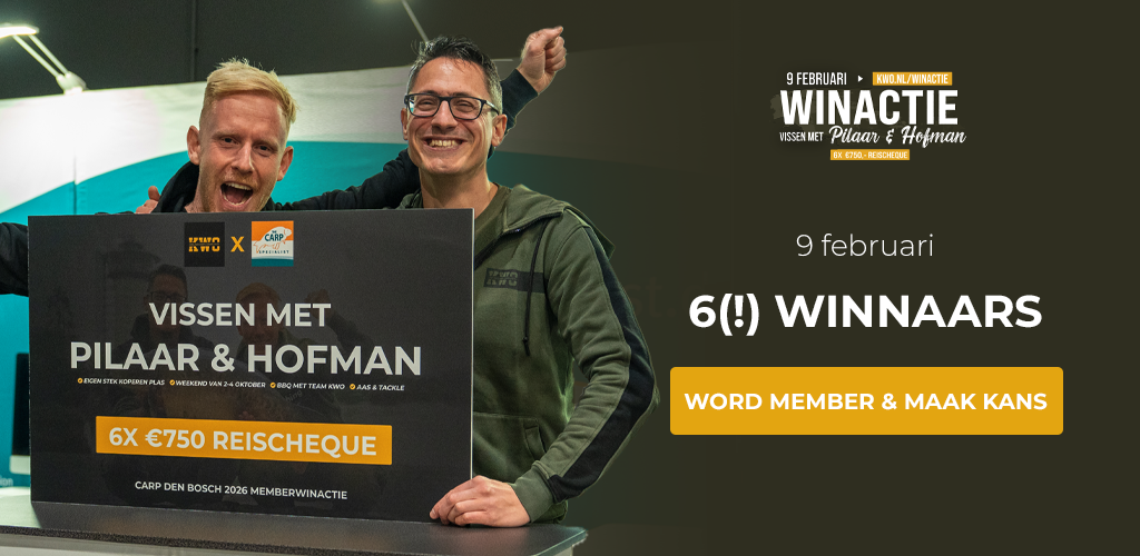 Ben je KWO Member, dan doe je automatisch mee. Geen formulieren, geen extra stappen en je kunt live meekijken hoe we de winnaars bekend maken. Nog geen KWO Membership? Dan is dit het perfecte moment om lid te worden! Je maakt dan zes keer kans op één van de reischeque voor dit “vissen met Pilaar & Hofman” weekend én krijgt toegang tot de beste karpervideo’s, kortingen bij tientallen hengelsportpartners en nog veel meer exclusieve acties.