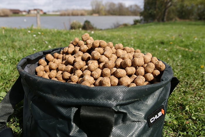 Omdat het water nu nog koud is, vier tot zeven graden op de bodem, voeren we een handje per hengel per dag. We gebruiken dumbels omdat de structuur altijd meer open is dan boilies. Hierdoor wasemt het aas perfect uit!